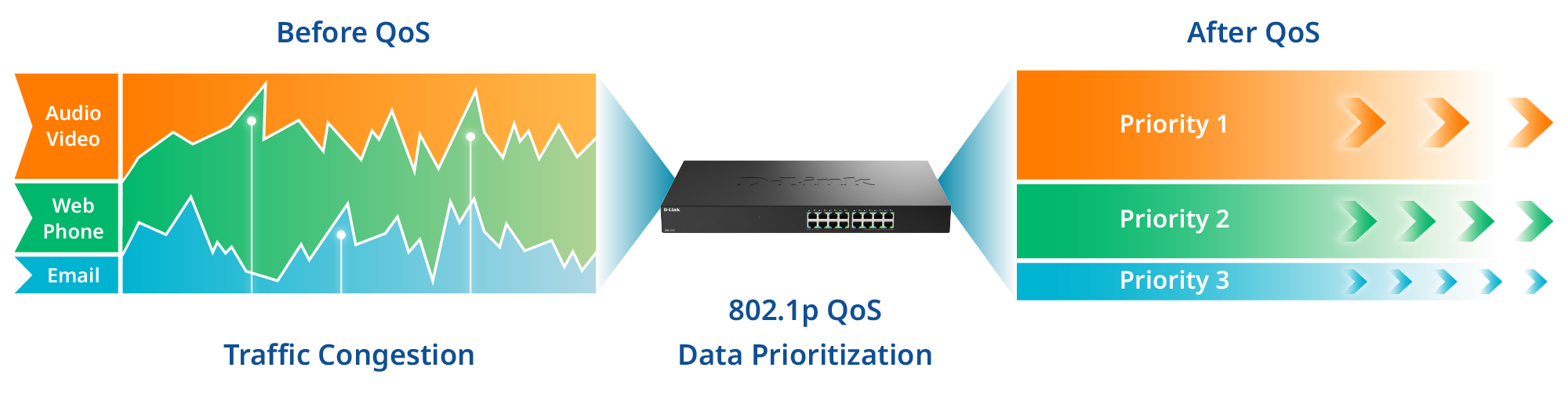 Avec le DMS-1016, vous pouvez gérer sans effort votre trafic réseau avec la fonctionnalité 802.1p Quality of Service (QoS). Le switch est doté de la Qualité de service 802.1p (QoS), qui organise et hiérarchise les données critiques et à durée de vie limitée pour une diffusion efficace, permettant un streaming vidéo sans mise en mémoire tampon ainsi que des appels vidéo et vocaux fluides.