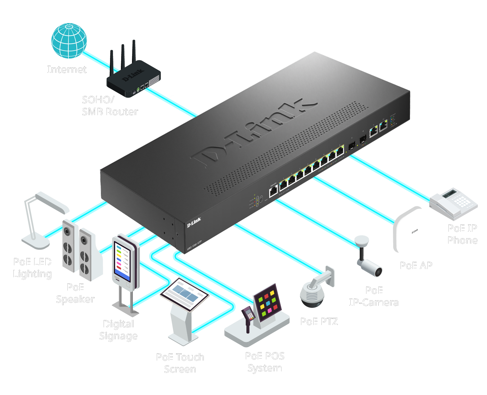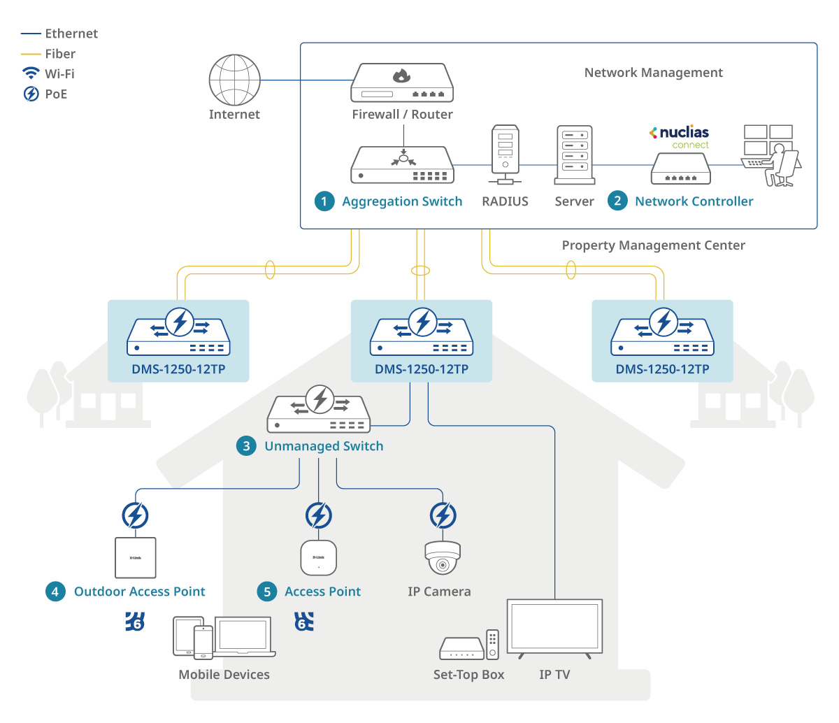 Les switches de la série DMS-1250 sont polyvalents et conviennent aux environnements de télétravail, de PME et d’unités résidentielles multiples. Ils assurent une transmission de données à haut débit avec 2,5 GE et une liaison montante 10G cruciale pour la connectivité externe. Cette liaison montante à haut débit garantit que l’ensemble de l’unité MDU peut accéder à des services externes sans rencontrer de goulots d’étranglement de données. De plus, IEEE 802.3at ou IEEE 802.3bt sont efficacement implémentées dans DMS-1250-10SP, 10SPL et 12TP pour permettre aux appareils de se connecter et de recevoir l’alimentation.