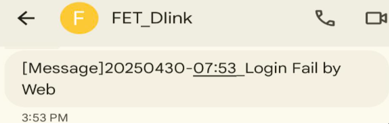 When someone tries to log in to the device web GUI with an incorrect ID or password, the DOM-530-TSO will send an SMS message to the user.