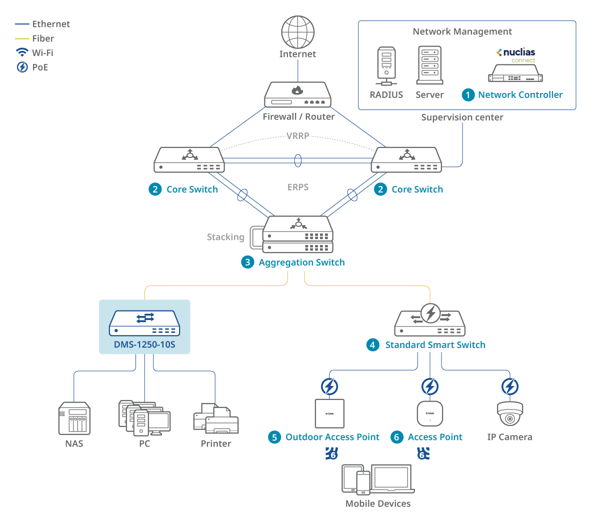 The DMS-1250 Series switches support the Nuclias Network Controller for centralized management, simplifying device configuration and enhancing network efficiency. Features like device discovery, real-time monitoring, and updates ensure robust control and optimized operations.