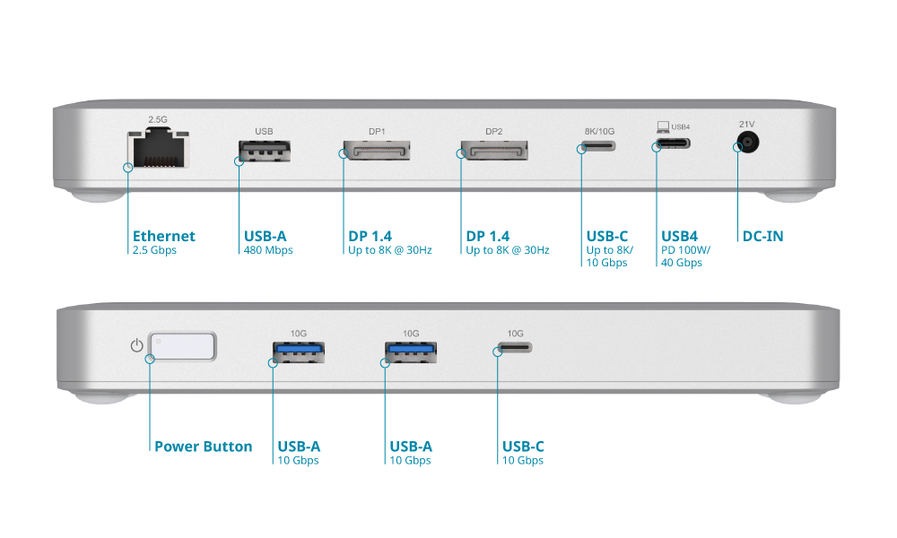 DUF-901 vybaví váš notebook devíti všestrannými porty pro práci i zábavu. Zažijte stabilní ethernetovou síť s rychlostí 2,5 Gb/s, ohromující obraz v rozlišení 4K/8K prostřednictvím duálního portu DP 1.4 a multifunkčního portu USB-C (režim DP Alt, až 8K) a bleskově rychlé přenosy 40 Gb/s s USB4 a 10 Gb/s s pomocnými porty USB-A/C. Další port USB-A (480 Mb/s) zajišťuje kompatibilitu se staršími zařízeními, to vše v jednom elegantním a výkonném doku.