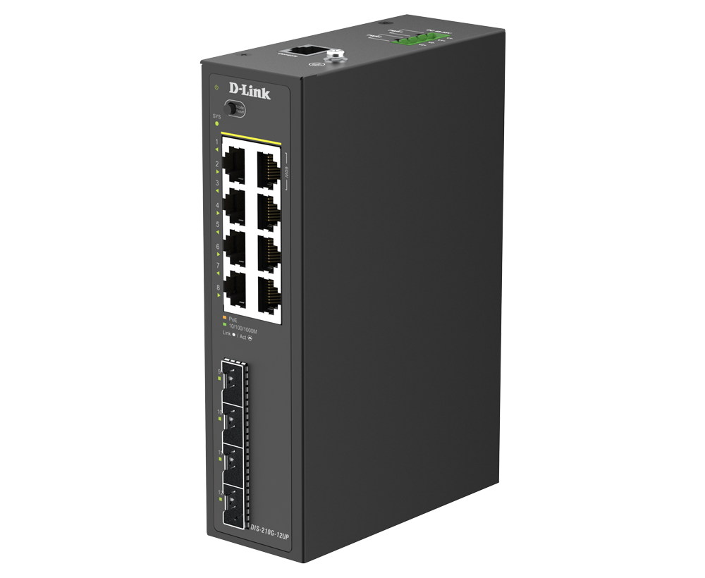 The DIS-210G-12UP is equipped with eight PoE ports compliant with IEEE 802.3af/at/bt standards, delivering both data and power through a single Ethernet cable.