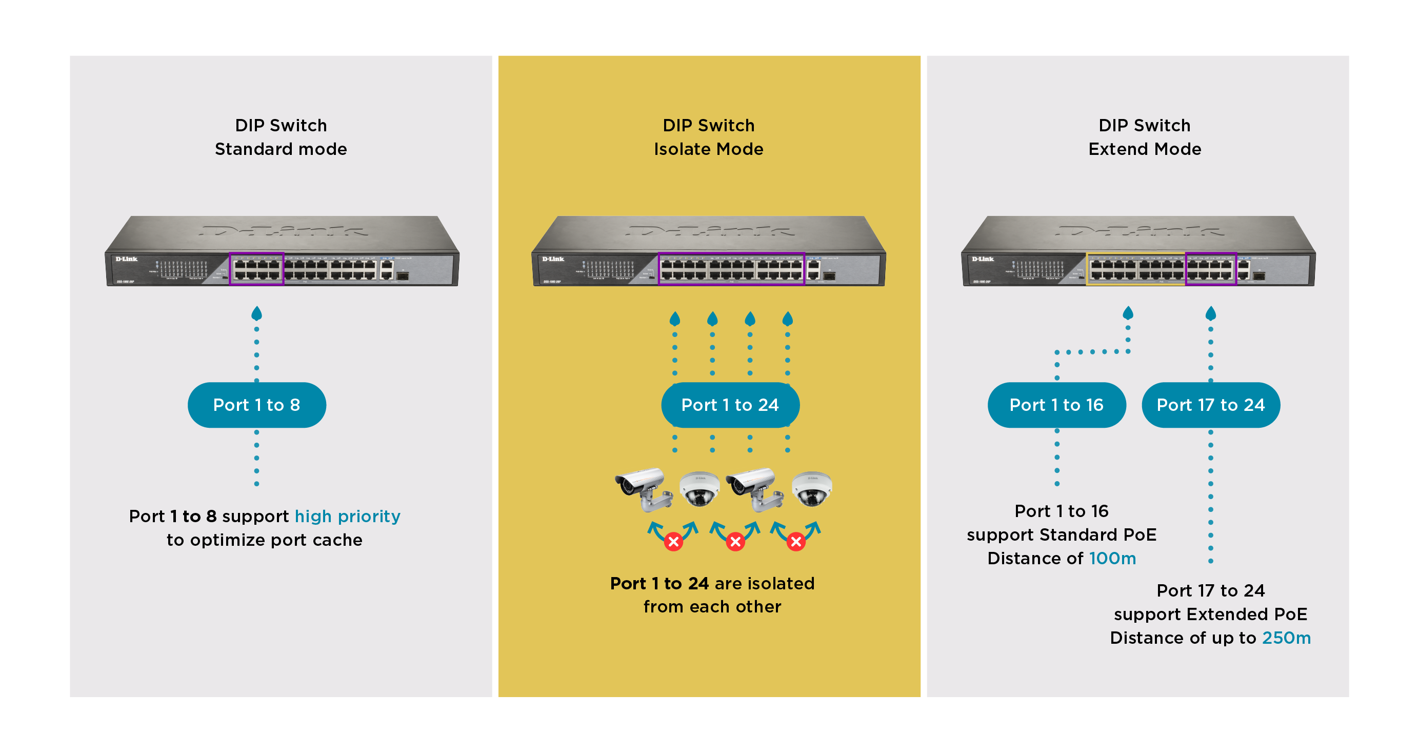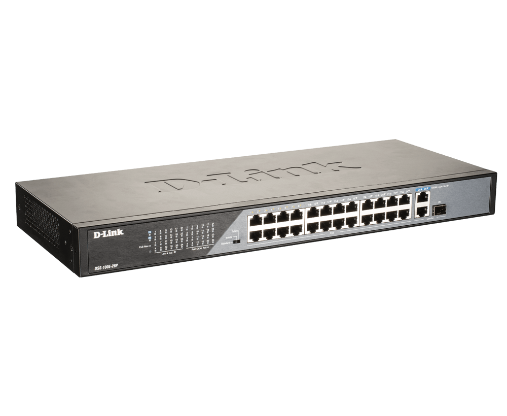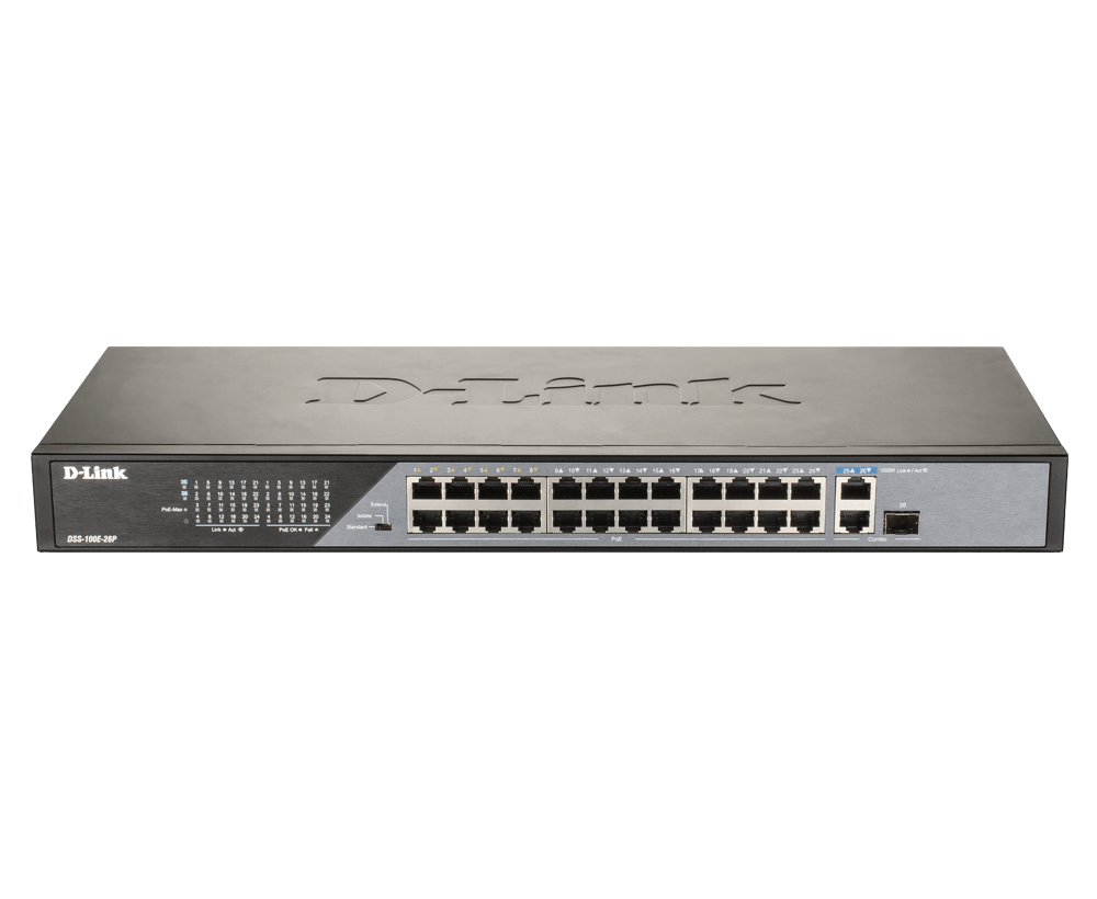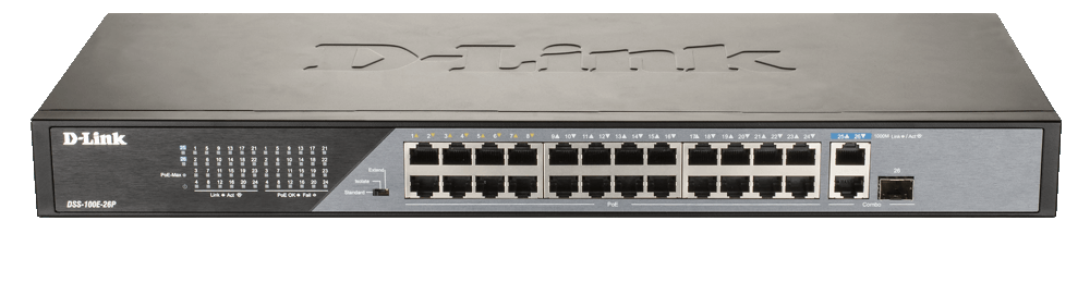 The DSS-100E-26P has a total PoE power budget of 230W, meaning it’s ready to power your PoE-ready cameras and other devices. Simply connect your PoE supported devices and you’ve got a capable surveillance network with minimal wiring required. Meanwhile, it has an extended PoE range of 250m, reaching devices further than before. Finally, it has 1 Gigabit and 1 Gigabit/SFP combo uplink port which provides ample bandwidth. This ensures smooth transmission of footage when connecting to Network Video Recorder (NVR) or core switch.
