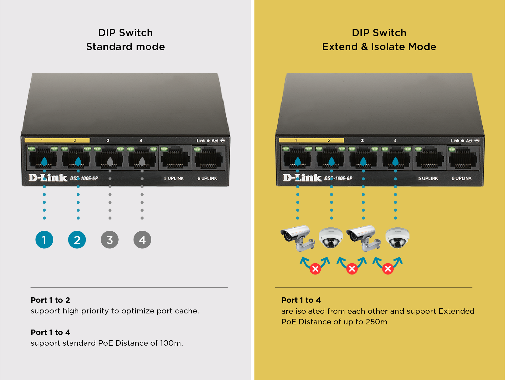 The DSS-100E-6P has a total PoE power budget of 55W, meaning it’s ready to power your PoE-ready cameras and other devices. Simply connect your PoE supported devices and you’ve got a capable surveillance network with minimal wiring required. Meanwhile, it has an extended PoE range of 250m, reaching devices further than before. Finally, it has 2 Fast ethernet uplink ports which provides ample bandwidth. This ensures smooth transmission of footage when connecting to Network Video Recorder (NVR) or core switch.