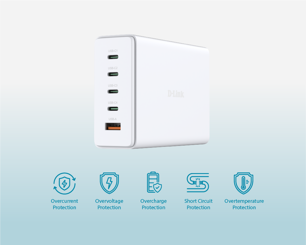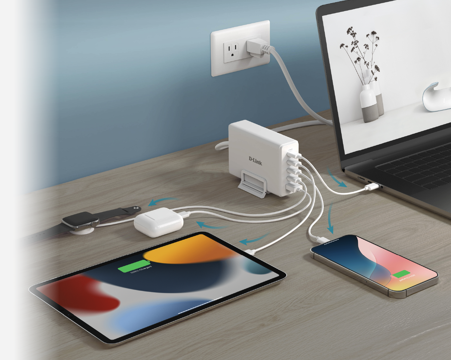The D-Link DCF-241 GaN Charger delivers up to 240W of ultra-fast charging, perfect for powering two laptops, a tablet, a cell phone, and more at once. With four USB-C ports and one USB-A port, it keeps your entire setup running efficiently while reducing clutter, making it the ultimate power hub for your home workspace.