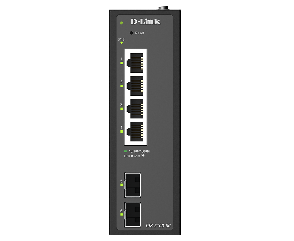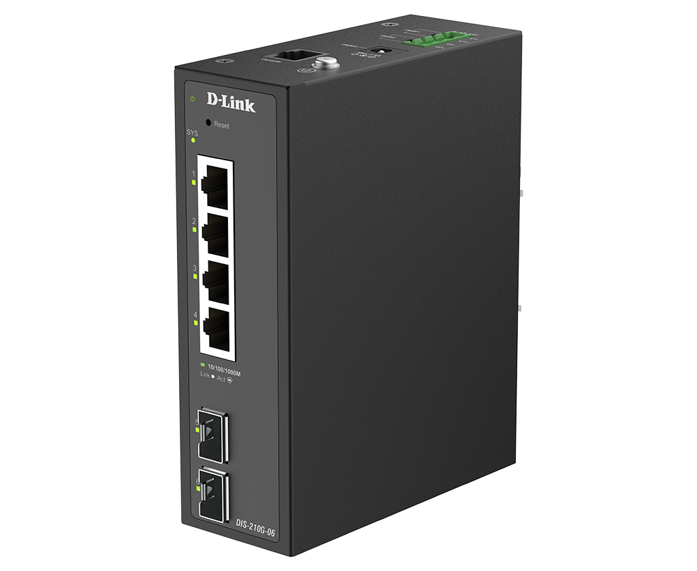 The DIS-210G-06 is an industrial smart switch equipped with four 1G ports and two 1G SFP ports for network management and aggregation. The SFP ports support long-distance data transmission, rapid failover redundancy, and throughput aggregation. The DIS-210G-06 supports ERPS and static routing, which reduces latency, enables effective traffic control, and improves network scalability and efficiency.