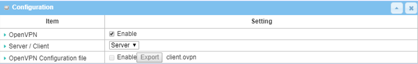 | OpenVPN Configuration File | Click the Export button to download the client.opvn file |