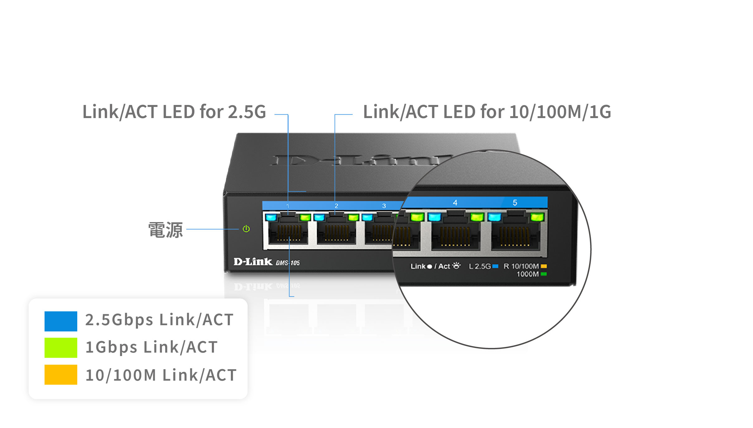 每埠網路端口都支援 10/100Mbps/1G/2.5G 速率,多種 LED 指示燈,幫助使用者輕鬆