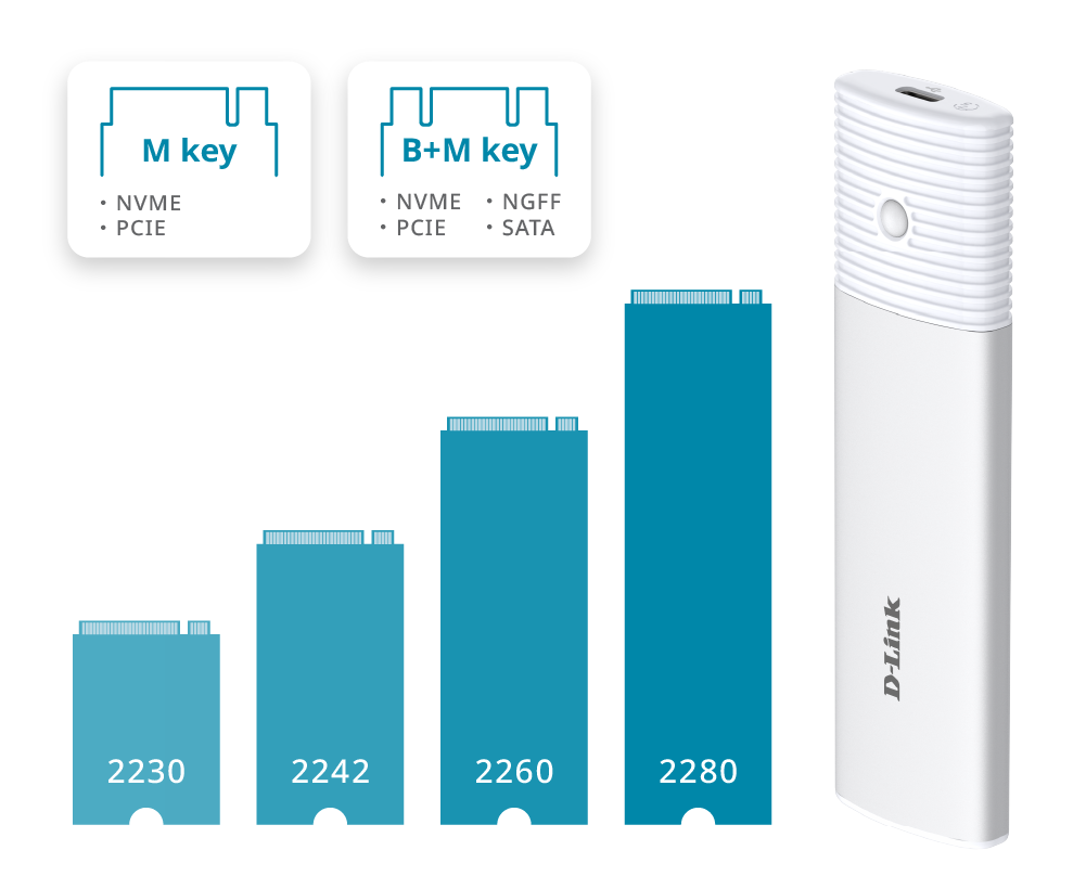 The D-Link DSP-111 SSD Enclosure offers ultra-fast 10 Gbps transfers, up to 4 TB capacity, NVMe/NGFF SSD support, and a durable, lightweight design. It is ideal for mobile professionals, as it delivers reliable, high-speed storage on the move with a tool-free setup and broad device compatibility.