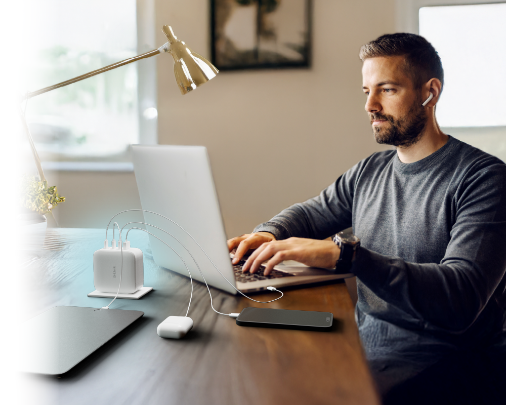 Streamline your home workspace with the D-Link DCF-141. This powerful 140W GaN charger powers a laptop, a tablet, a cell phone, and more simultaneously at full speed. Compact and efficient, it helps you stay focused and fully charged throughout the day, without the clutter of multiple adapters.