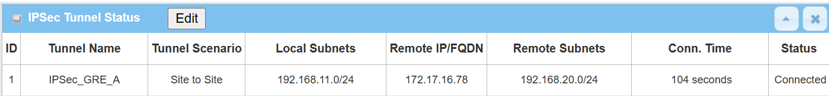 After the GRE tunnel is established, also test remote access from LAN clients by using ping <Remote LAN interface IP> or < Remote LAN device IP> within the Remote Subnet.