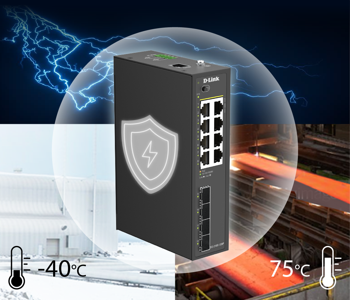 The DIS-210G-12UP is built with a rugged, durable design ideal for harsh environments such as outdoor installations, unconditioned factory floors, and remote sites. With a wide operating temperature range of -40°C to 75°C, it ensures stable and reliable performance even in extreme conditions. Its industrial-grade IP40-rated enclosure protects against dust and solid particles larger than 1mm, while the fanless design and 6kV surge protection on all Ethernet ports help reduce the risk of downtime and enhance long-term reliability.