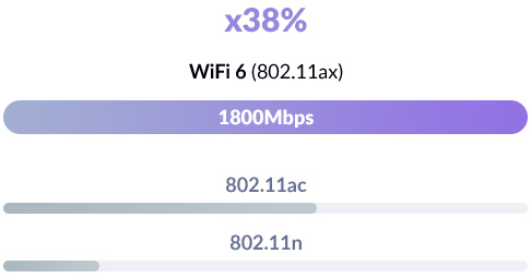 Bring home next-gen Wi-Fi 6 speeds of up to 1.8 Gbps. Experience a jump of 90% faster speed on the 2.4 GHz band and nearly 40% faster speed on the 5 GHz band, for a better way to enjoy snappier browsing, 4K streaming and online gaming.