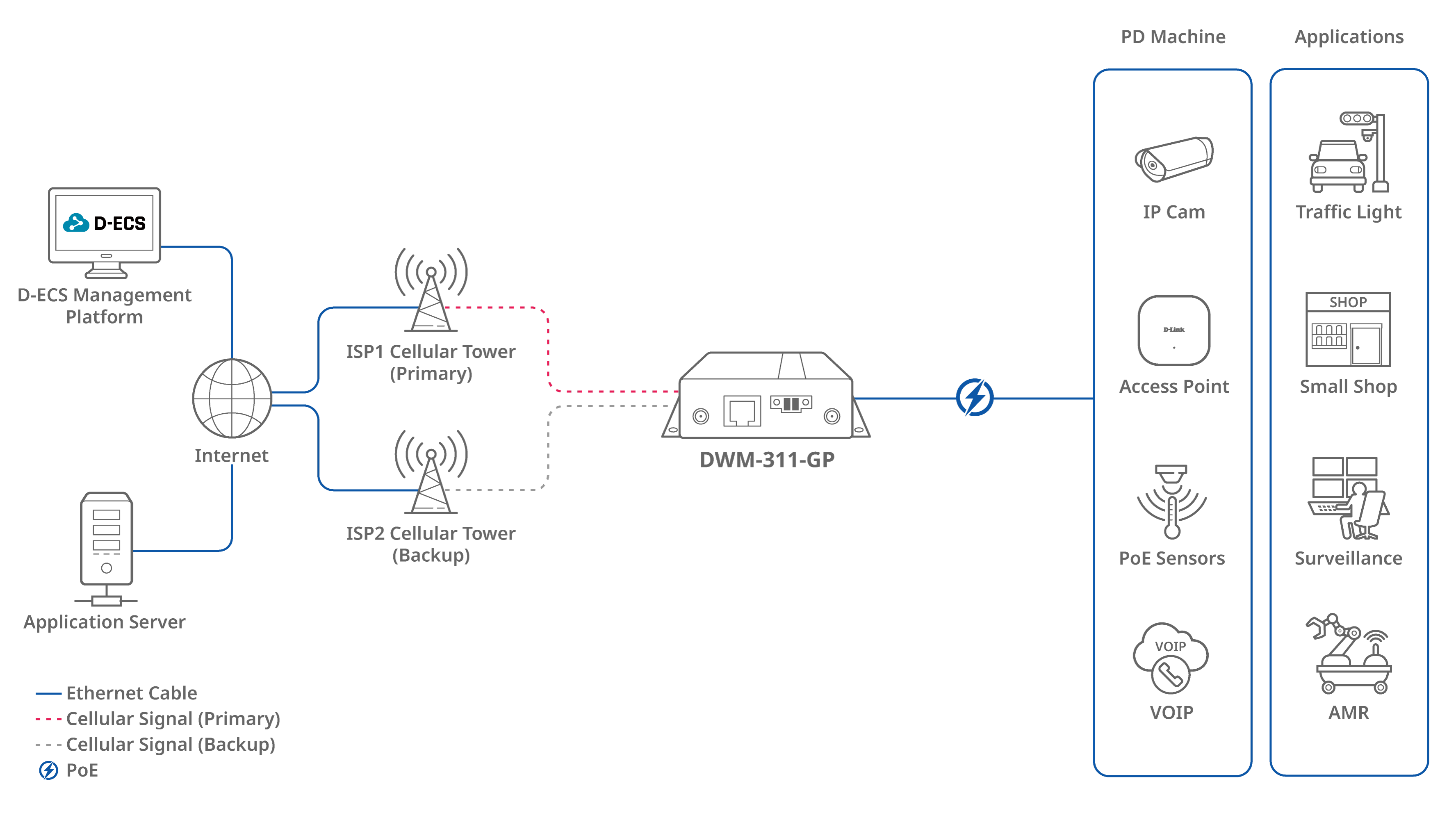 The DWM PoE Modem Series, featuring 802.3af/at Power over Ethernet (PoE+) technology, delivers both data and power through a single Ethernet cable. As a true PSE (Power Sourcing Equipment) solution, it streamlines M2M communication for IoT applications, reducing the need for separate electrical infrastructure and lowering installation costs. Ideal for powering surveillance cameras, digital signage, wireless access points, and IoT sensors, it offers flexible device placement without extra wiring. Its PD-Alive feature minimizes downtime, ensuring continuous operation, while PoE scheduling optimizes power use and cuts energy costs.