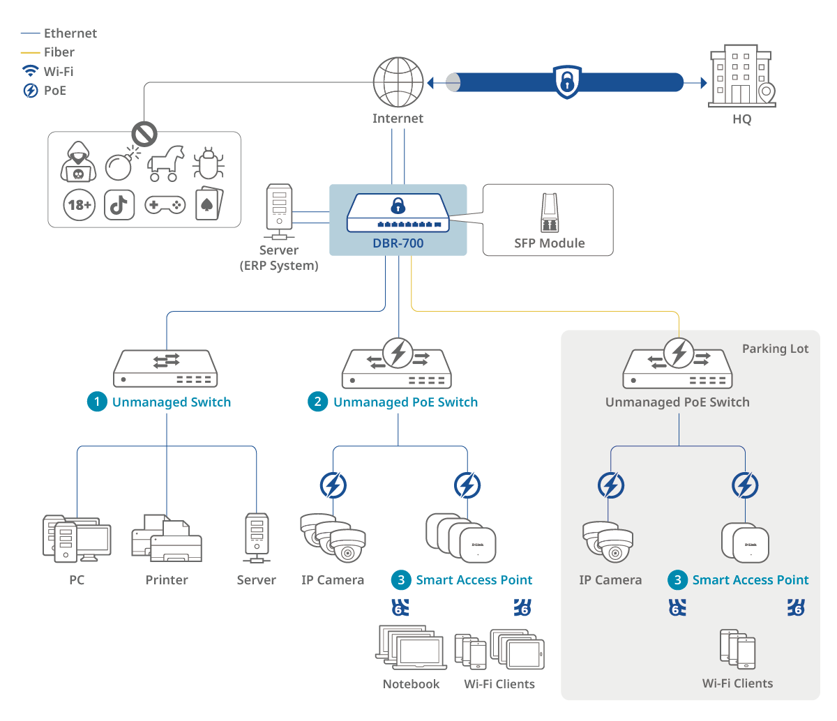 Via een intuïtieve webinterface bewaakt de DBR-700 centraal de hele netwerkstatus en beheert hij eenvoudig de configuratie van geavanceerde functies. Geïntegreerd draadloos beheer ondersteunt tot 15 Smart AP (DBR-X3000-AP)-apparaten, waardoor administratieve taken zoals radio-instellingen, client monitoring en toegangscontrole worden vereenvoudigd. Probleemloos beheer en realtime inzicht in de netwerkactiviteit helpen eigenaren van kleine ondernemingen om de algehele operationele efficiëntie te verbeteren.