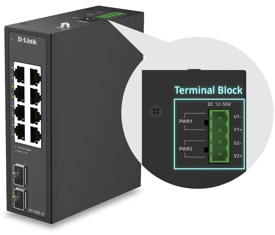 The DIS-100G-10 is equipped with dual power supply options. Each is capable of independently powering the device. This built-in redundancy ensures continuous operation even if one power source fails, minimizing shutdown risk and maintaining network performance. As industrial environments are common with unstable power conditions, its wide voltage range of 12 – 55V DC supports diverse power sources while protecting against surges and low voltage, delivering a stable and dependable power supply.