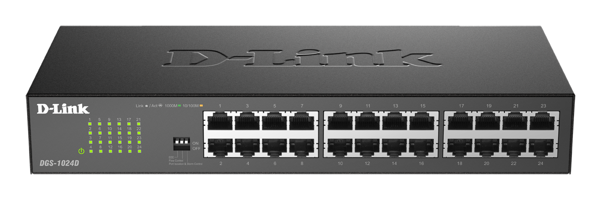 24-portový neřízený Gigabitový přepínač DGS-1024D nabízí ekonomický způsob, jak mohou kanceláře (SOHO) a malé a střední podniky (SMB) využít výhod rychlosti Gigabit Ethernetu. Přepínač lze umístit do 19" rozvaděče nebo na stůl přímo v kanceláři. Provedení bez ventilátoru umožňuje tichý a energeticky úsporný provoz.