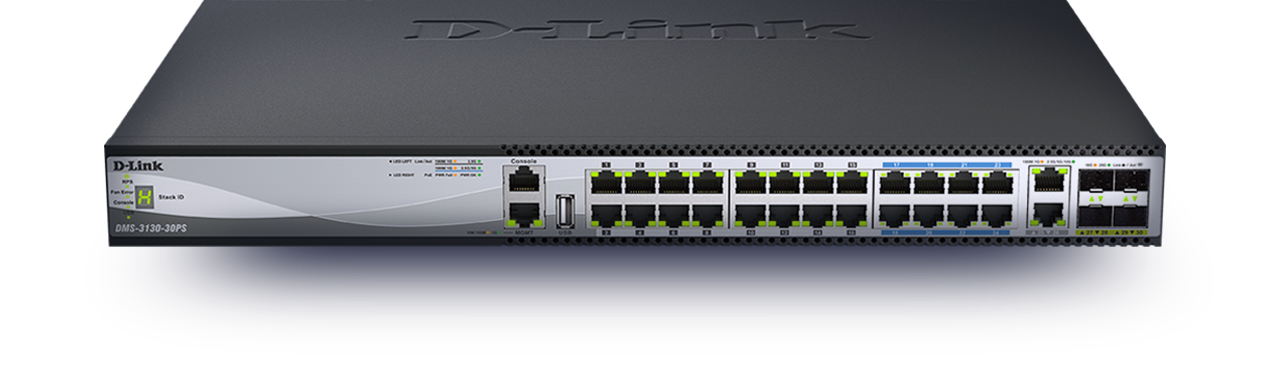PoE+ /PoE++ with budgets up to 960W DMS-3130-30PS provides sixteen 2.5G ports supporting 802.3af/at PoE and eight 5G ports supporting 60W 802.3bt PoE standards with a power budget of 740 watts expandable to 960 watts with dual power supplies.