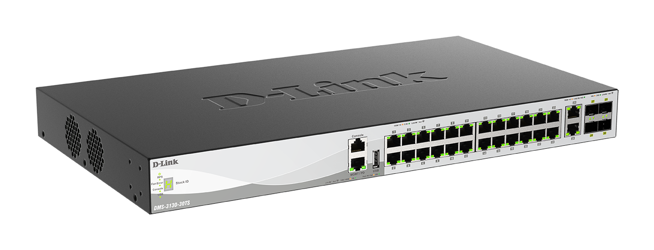 x4 25G SFP28 uplink ports, physical stacking for redundancy, and have built-in G.8032 Ethernet Ring Protection Switching (ERPS) to help minimise recovery times to 50 ms. An USB 2.0 interface to store config files, boot images, and syslog. As well as support for an additional external redundant power supply on all models to ensure maximum uptime. DMS-3130-30PS even supports PoE PD function on the MGMT port, allowing it to be powered by a PoE switch.