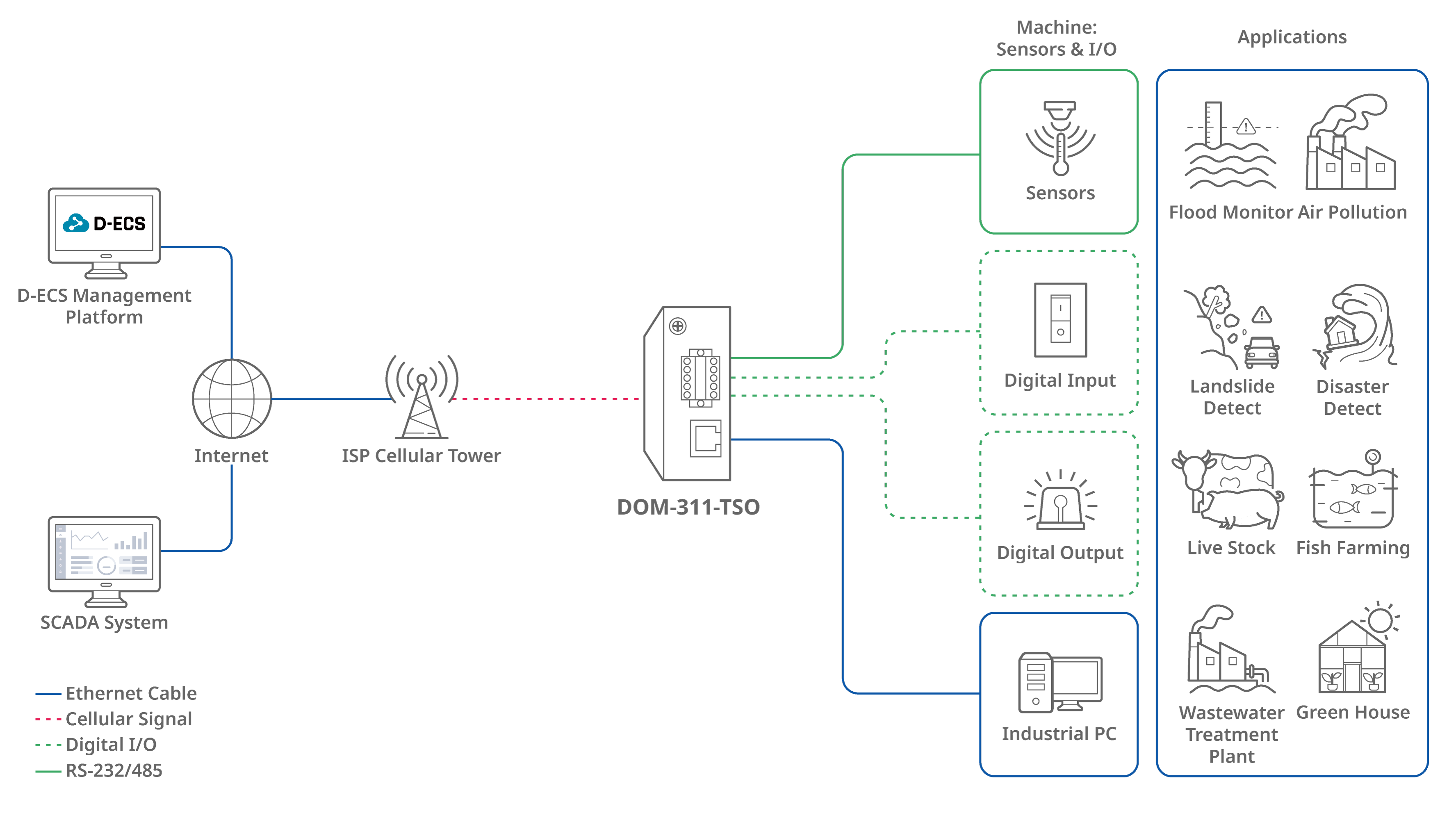 DOM-311-TSO vyniká v poskytování spolehlivé konektivity pro IoT aplikace podporou připojení k senzorům, digitálním I/O a průmyslovým PC. Díky této flexibilitě je ideální pro nasazení v řadě aplikací pro monitorování životního prostředí, včetně monitorování záplav, kontroly znečištění ovzduší, detekce sesuvů půdy, reakce na katastrofy, řízení dobytka, chovu ryb, čištění odpadních vod a skleníků, což zajišťuje efektivní sběr dat a správu systému.