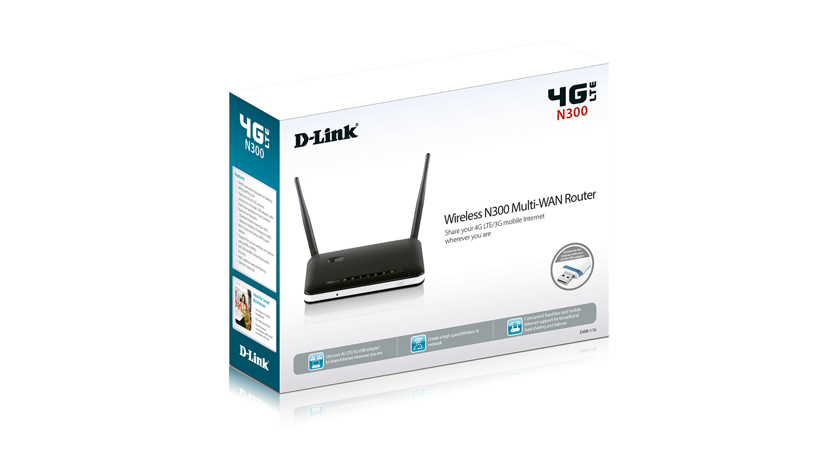 DWR-116 bezdrátový N300 Multi-WAN Router umožňuje sdílet superrychlý 4G LTE / 3G mobilní internet současně se smartphonem, tabletem, notebookem a stolním počítačem. Podpora 4G LTE / 3G od jakéhokoliv mobilního operátora přes USB dongle³ je ideálním řešením pro nastavení internetového připojení, které můžete sdílet se svými kolegy nebo na dovolené s rodinou nebo přáteli. Wireless N umožňuje vytvořit rychlý a bezpečný vysokorychlostní osobní hotspot s bezdrátovou rychlostí až 300 Mbps¹. Simultánní 4G LTE / 3G mobilní internet a podpora širokopásmového internetového připojení vám umožní připojení kombinovat i v případě výpadku jednoho z nich.