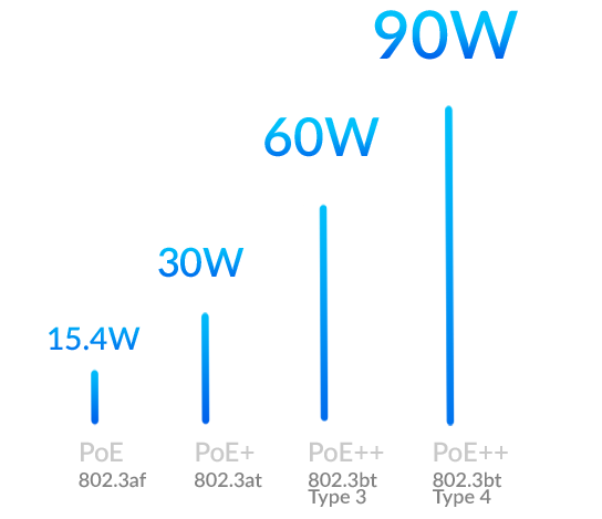 Utilise our Power over Ethernet range to reduce costs and simplify deployments of surveillance cameras, access points, and other PoE devices by transmitting data and power over a single standard RJ45 Ethernet cable, without the need for an electrical outlet nearby. Several PoE types with higher wattage up to 90W per port enable data and power to be sent to a growing number of power-hungry devices, from VoIP telephony and dome IP cameras, to laptops and monitors, and more.