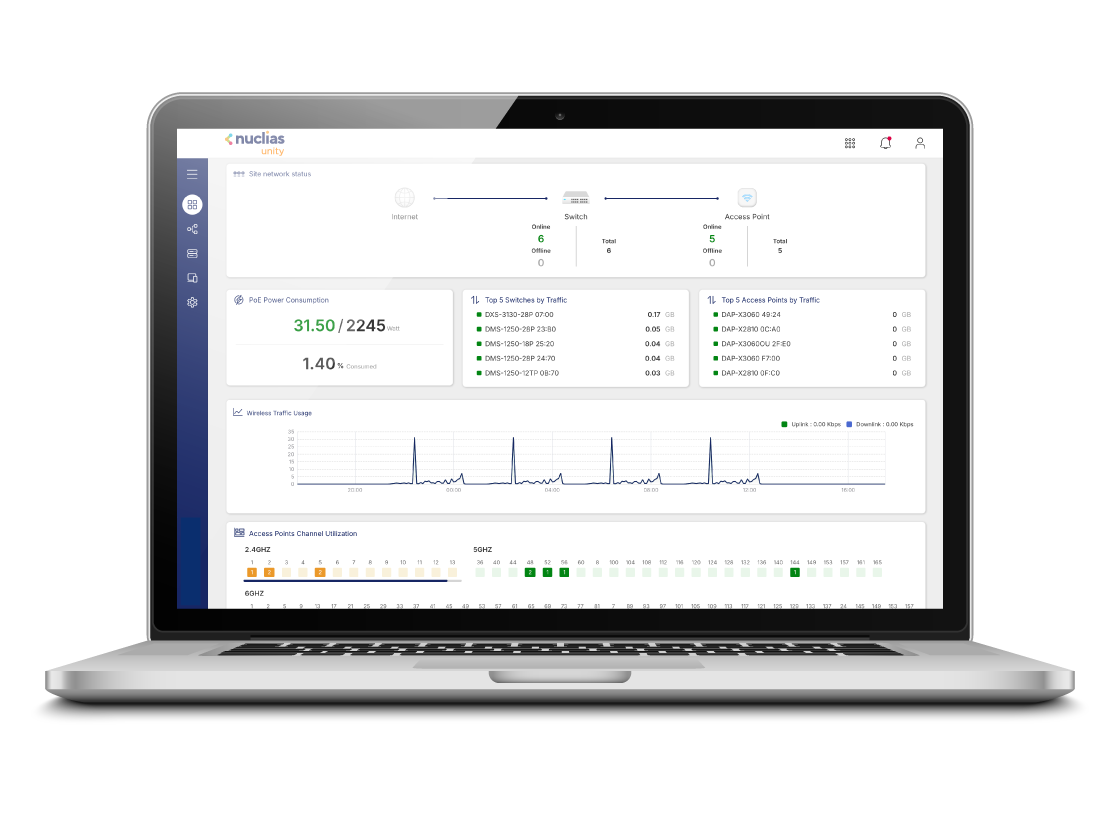 Nuclias Unity is your single pane of glass for complete, cloud-based network control. Unify the setup, monitoring, and security of all your APs and switches from one intuitive dashboard—with zero added license fees. Visualize your entire network on a live topology map, push centralized configurations with a click, and get proactive alerts. Deploy faster, troubleshoot smarter, and simplify your IT life and reclaim your time.