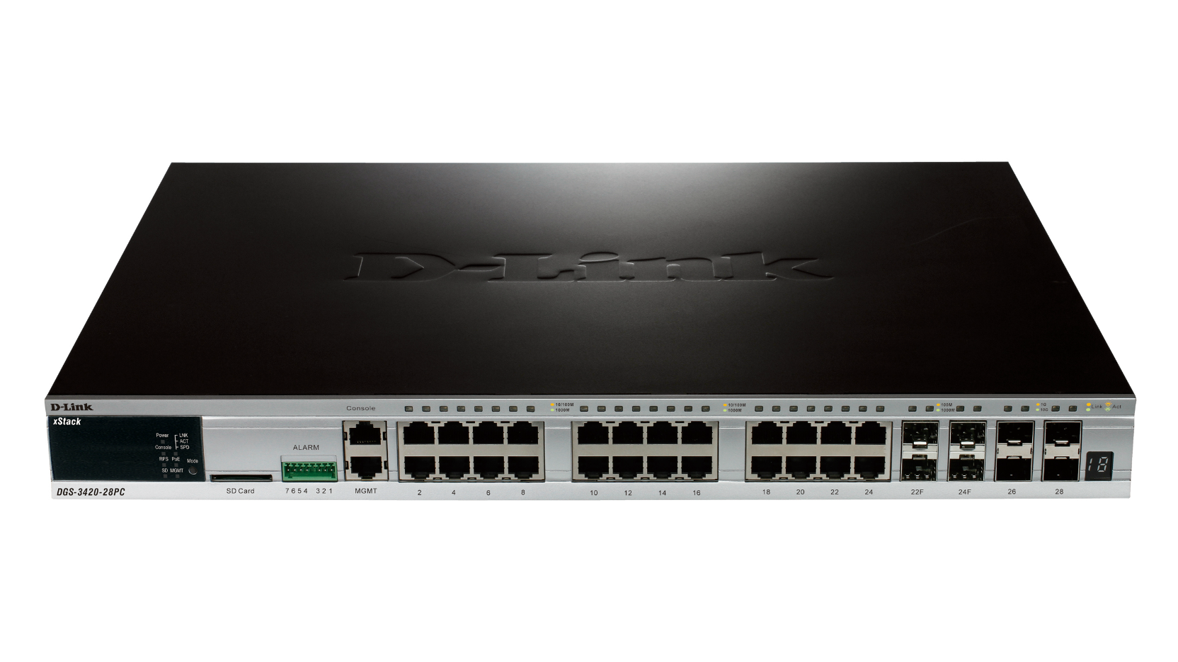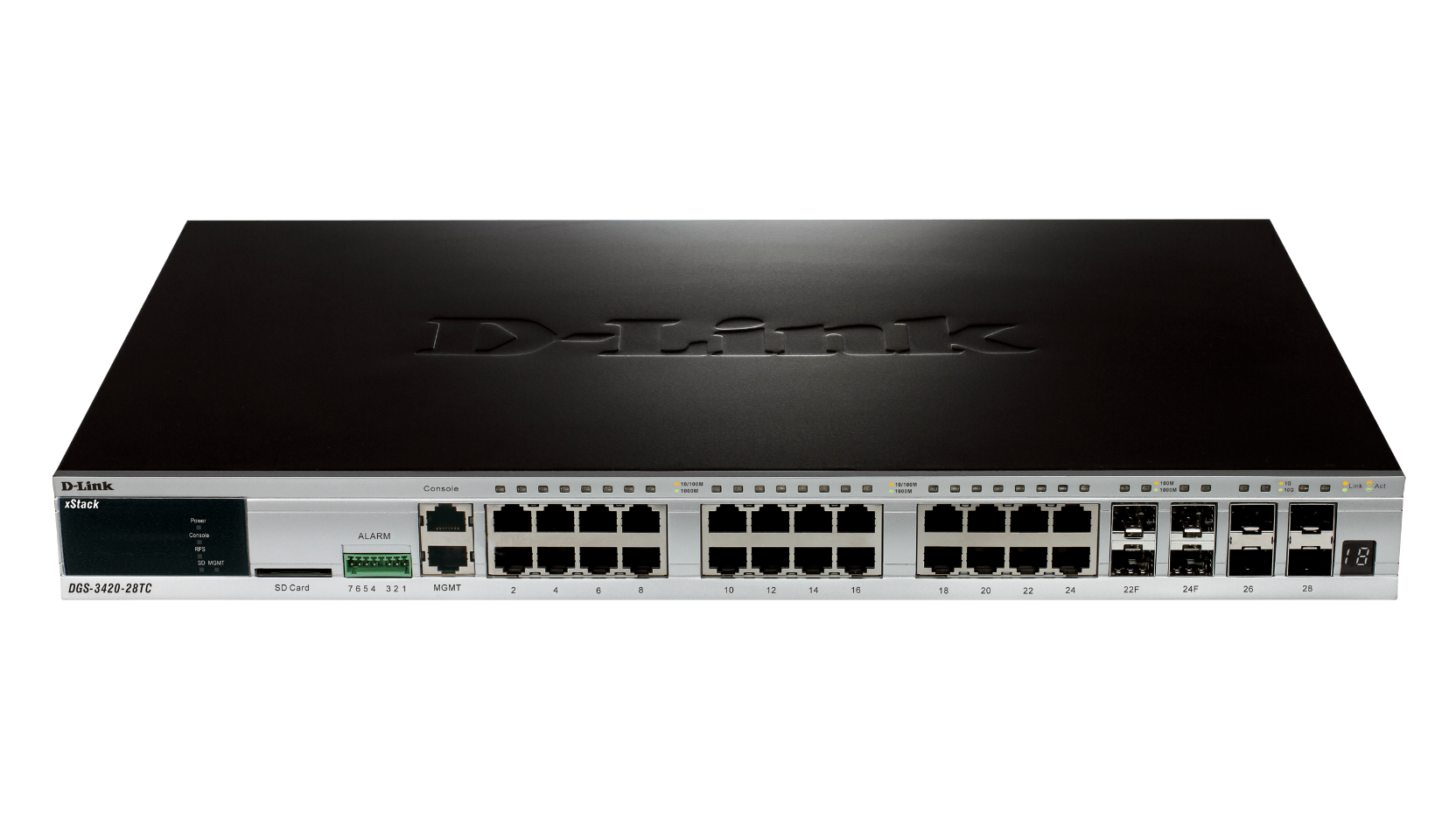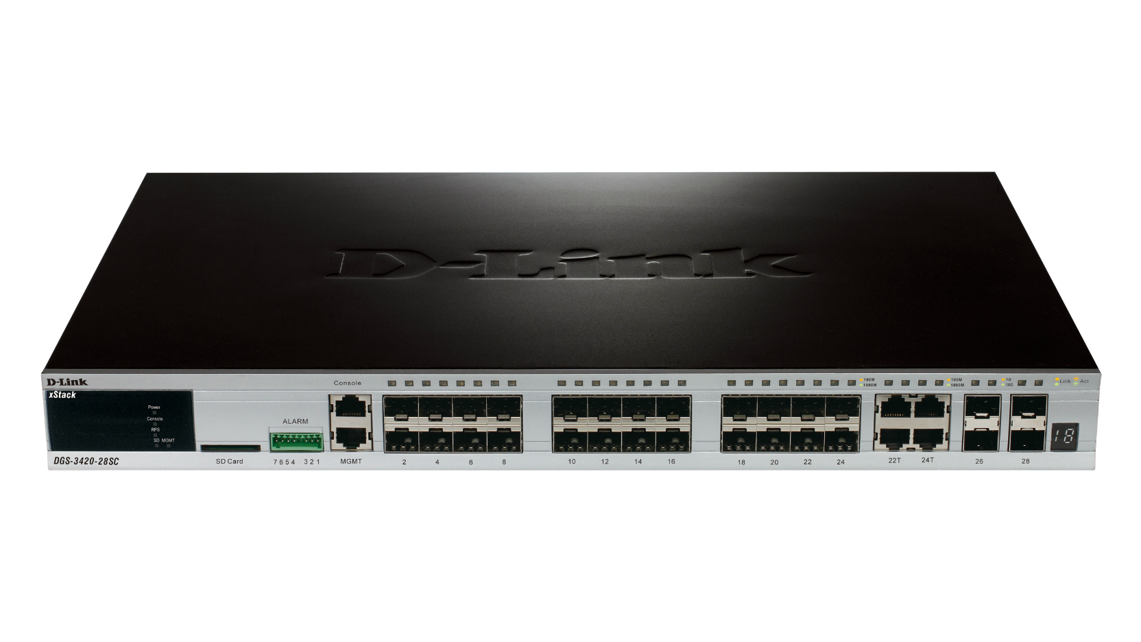 - DGS-3420-28SC: 28-Port Gigabit SFP L2+ Stackable Managed Switch including 4 x Combo 1000BASE-T/SFP ports and 4 x 10 Gbps SFP+ ports