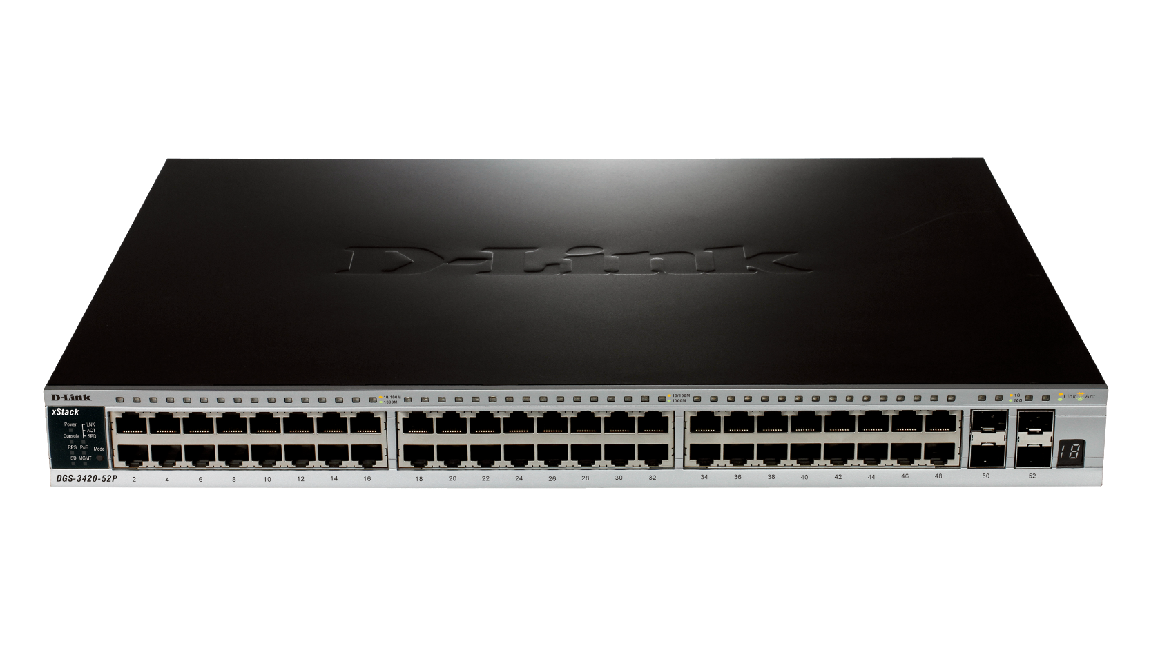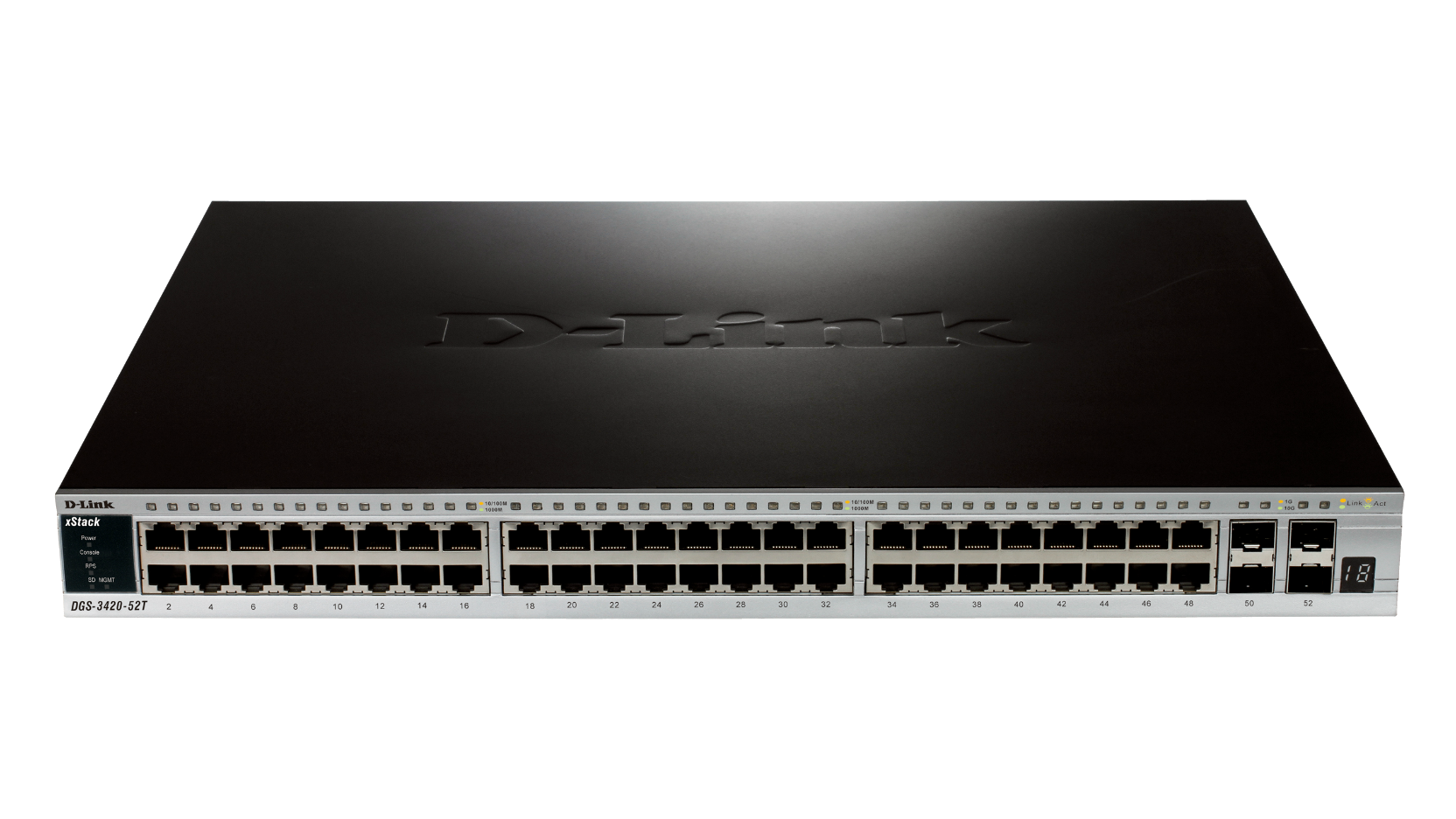 - DGS-3420-52T: 52-Port Gigabit L2+ Stackable Managed Switch including 4 x 10 Gbps SFP+ ports