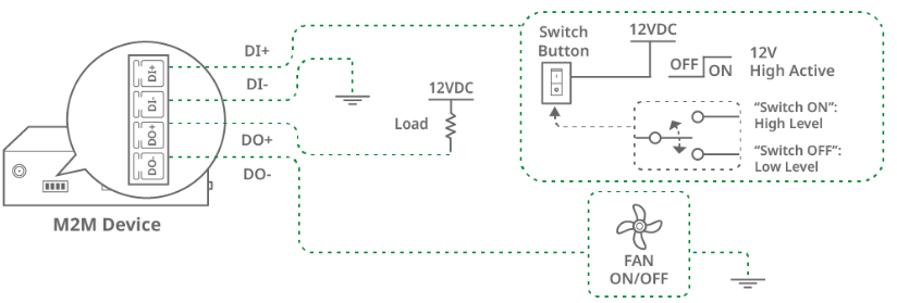 Please note that it is necessary to add an external pull-up load for the external power supply. The DO of the M2M device does not provide active voltage/current output function. The DO of the M2M DOM Series products is a dry contact.