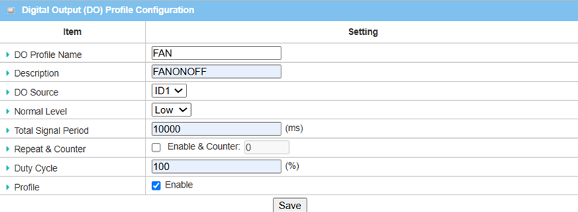 | Duty Cycle | Specify the Duty Cycle 100% for the Digital Output |