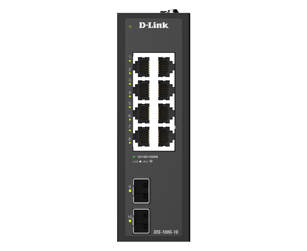 The DIS-100G-10 is an industrial unmanaged switch equipped with eight 1G ports and two SFP ports, providing plug-and-play simplicity deployment. The SFP ports support long-range data transmission, removing the distance limitations of traditional Ethernet cabling. With reliable, high-performance operation, it ensures real-time data transfer and seamless connectivity for applications such as Kiosk, digital signage, LED displays, and more.