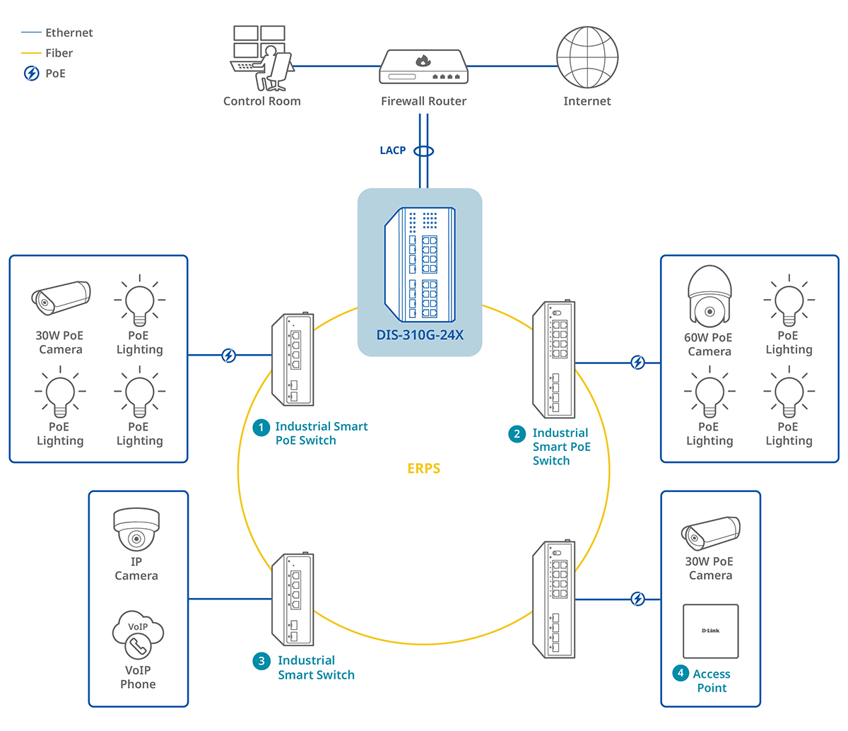 • Reliable fiber uplinks with ERPS ensure fast recovery