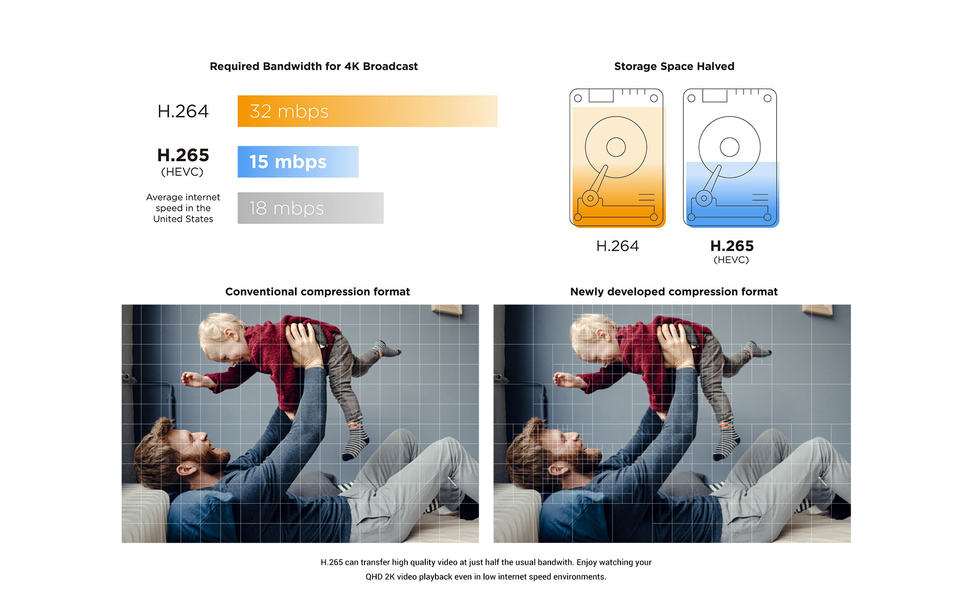 The latest industry standard allows for higher quality video recording, longer recording time and massively reduced bandwidth and storage consumption.