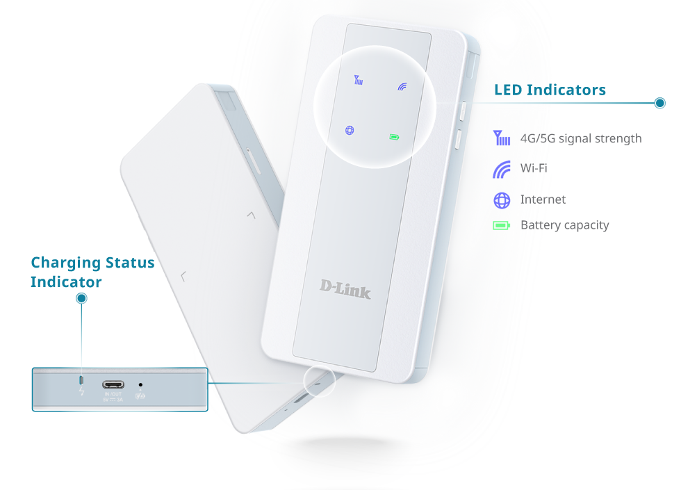 Stay instantly informed with easy-to-understand LED indicators, featuring color codes and blinking patterns that clearly show 4G/5G signal strength, Internet, Wi-Fi, battery capacity, and battery charging status.