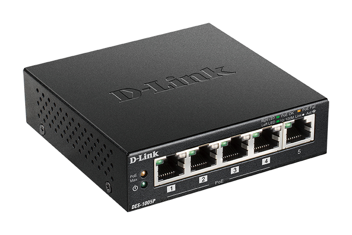The D-Link DES-1005P 5-Port Desktop Fast Ethernet PoE+ Switch enables you to connect Power over Ethernet (PoE) devices such as wireless access points (APs), IP cameras, and IP phones to the network. Built with home and small business users in mind, the DES-1005P is compact and operates silently, making it ideal for most rooms and offices.