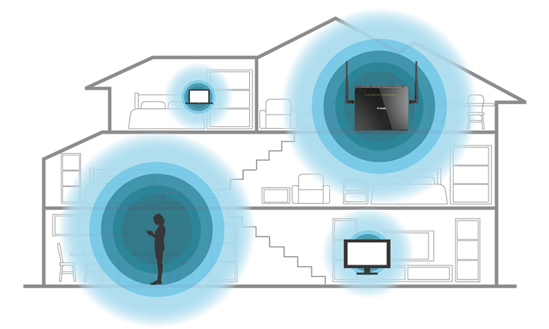 The DSL-G2452DG uses the latest Wireless AC technology, which provides transfer rates of up to 1.2 Gbps (866 AC + 300 N). The router operates on both the 2.4 GHz and 5 GHz wireless bands at the same time using concurrent dual-band technology and two external antennas. This allows you to browse the web, chat, and e-mail using the 2.4 GHz band, while simultaneously streaming digital media, playing online games, or making Internet voice calls on the 5 GHz band.