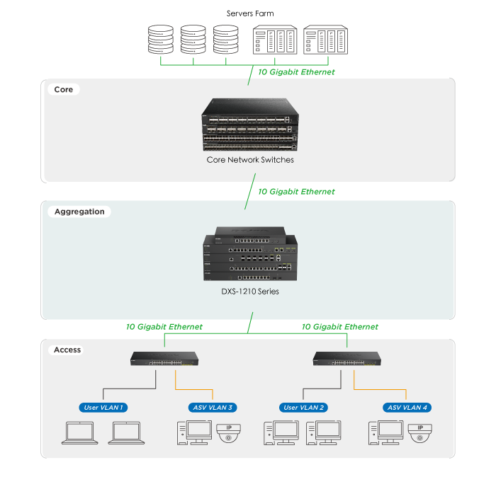 The DXS-1210 Series conveniently offers a range of 10-Gigabit copper and fiber port combinations to cost-effectively alleviate network congestion. Select models are equipped with SFP+ ports for 10G expandable network designed for scalability and can auto-detect surveillance and voice data to ensure uninterrupted video footage and jitter-free VoIP calls.
