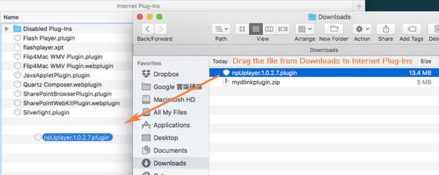 4. Open Downloads, Internet Plug-Ins windows, drag the unzipped file from Downloads to Internet Plug-Ins folder.