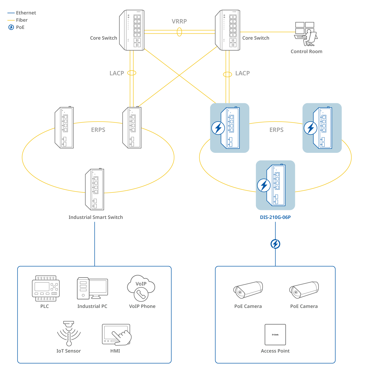 The DIS-210G-06P is an industrial smart switch equipped with four 1G ports and two 1G SFP ports for network management and aggregation. With a total power budget of up to 120W, each port can supply up to 30W. The SFP ports support long-distance data transmission, rapid failover redundancy, and throughput aggregation. The DIS-210G-06P supports ERPS and static routing, which reduces latency, enables effective traffic control, and improves network scalability and efficiency.
