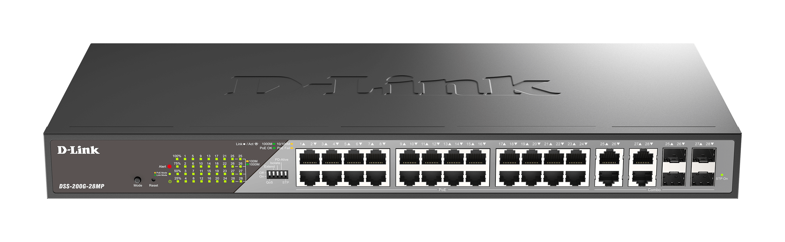See your remaining power availability with the built-in PoE Power Budget LEDs for 25%, 50%, 75%, and 100% power usage at a glance. And utilise up to 518W, with 90W on 8 ports and 30W on 15 ports for DSS-200G-28MPP, so you can rapidly deploy more devices.