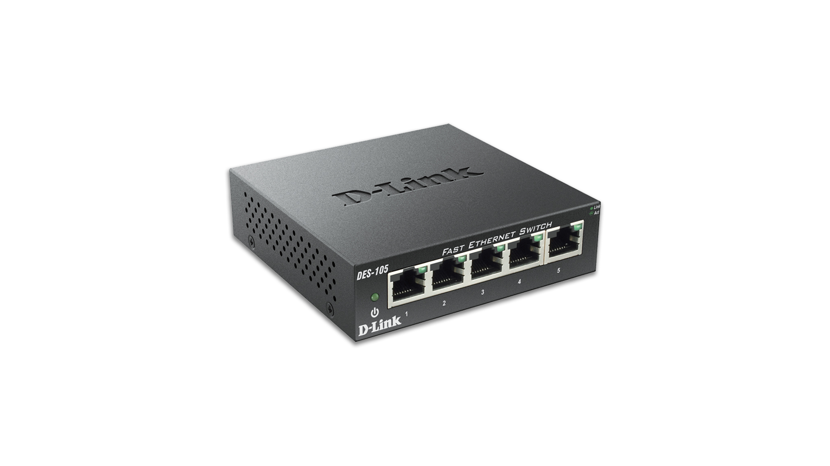 The DES-105 5-Port Fast Ethernet Unmanaged Desktop Switch is a 5-port 10/100 Mbps Fast Ethernet switch that allows you to quickly set up a wired network. Connect the DES-105 to multiple computers together to share files and folders, or connect it to a router to share an Internet connection.