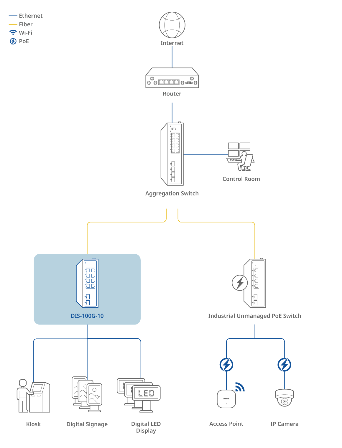 The DIS-100G-10 is an industrial unmanaged switch equipped with eight 1G ports and two SFP ports, providing plug-and-play simplicity deployment. The SFP ports support long-range data transmission, removing the distance limitations of traditional Ethernet cabling. With reliable, high-performance operation, it ensures real-time data transfer and seamless connectivity for applications such as Kiosk, digital signage, LED displays, and more.