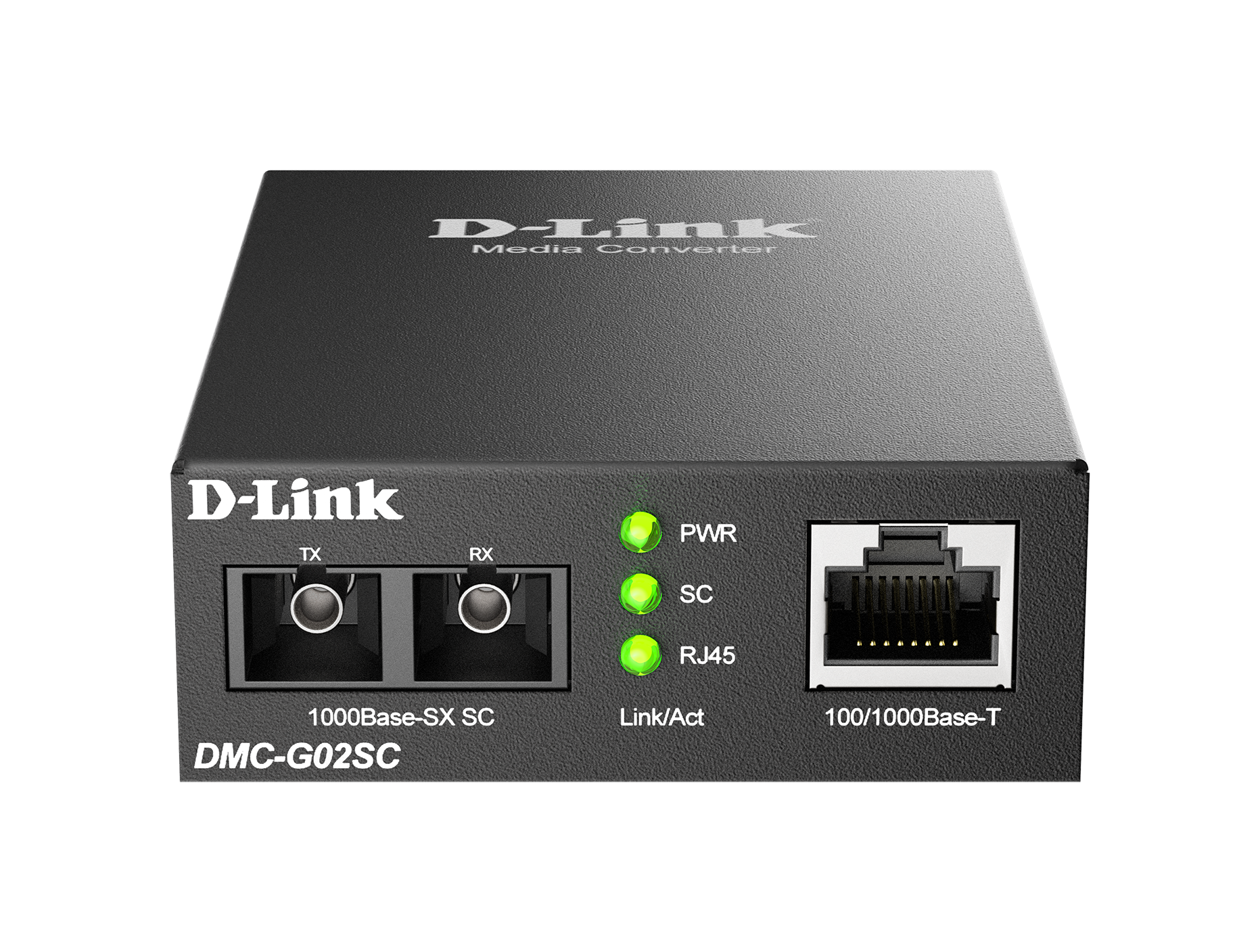 The DMC-G02SC is a media converter designed to convert a twisted-pair 100/1000Base-T Gigabit Ethernet connection to a multi-mode fibre 1000Base-SX Gigabit Ethernet connection to extend a connection distance (up to 550 m) between two devices. This media converter is equipped with one RJ-45 for twisted-pair and one fibre optic SC port.