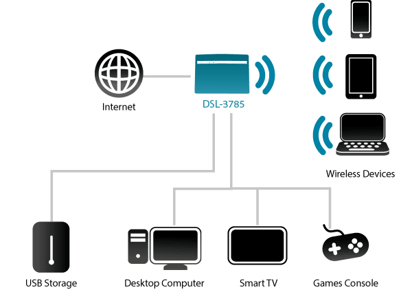 The DSL-3785 lets you connect a USB storage device and instantly share documents, movies, pictures, and music. You can put your music library on a USB drive and share it with your entire home. You can show photos on the living room TV while a family member watches a movie on their computer. You can stream media files to multiple devices without interruption, or save them to your device for offline playback. The intuitive interface lets anyone immediately connect to a variety of entertainment options stored securely on your own storage device.