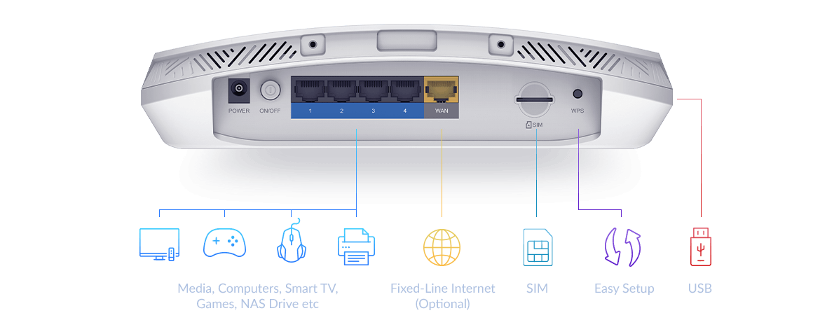 Med fyra Gigabit LAN-portar kan du ansluta upp till 4 trådbundna enheter för pålitliga och snabba trådbundna hastigheter upp till 10 gånger snabbare än vanliga Fast Ethernet-anslutningar.