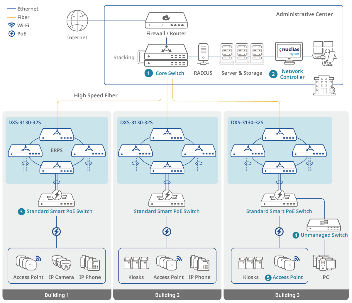 The DXS-3130-32S ensures continuous uptime with redundant power and stacking. It's 50ms ERPS recovery minimizes downtime, loopback detection blocks storm-affected ports, and VRRP provides seamless backup routing making it ideal for hospitals, factories, and other mission-critical networks.