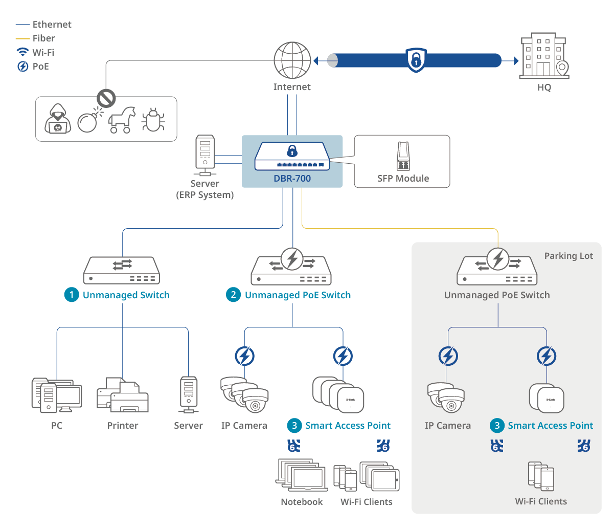 The DBR-700 features a 2.5G interface, providing higher bandwidth to support faster file transfers and lag-free, high-quality 4K/8K video streaming, enhancing daily productivity with more stable and reliable connectivity. The SFP (Small Form-Factor Pluggable) port enables long-distance data transmission, offering greater flexibility and scalability in network design. With the fiber port, businesses can easily scale their network without zone limitations.