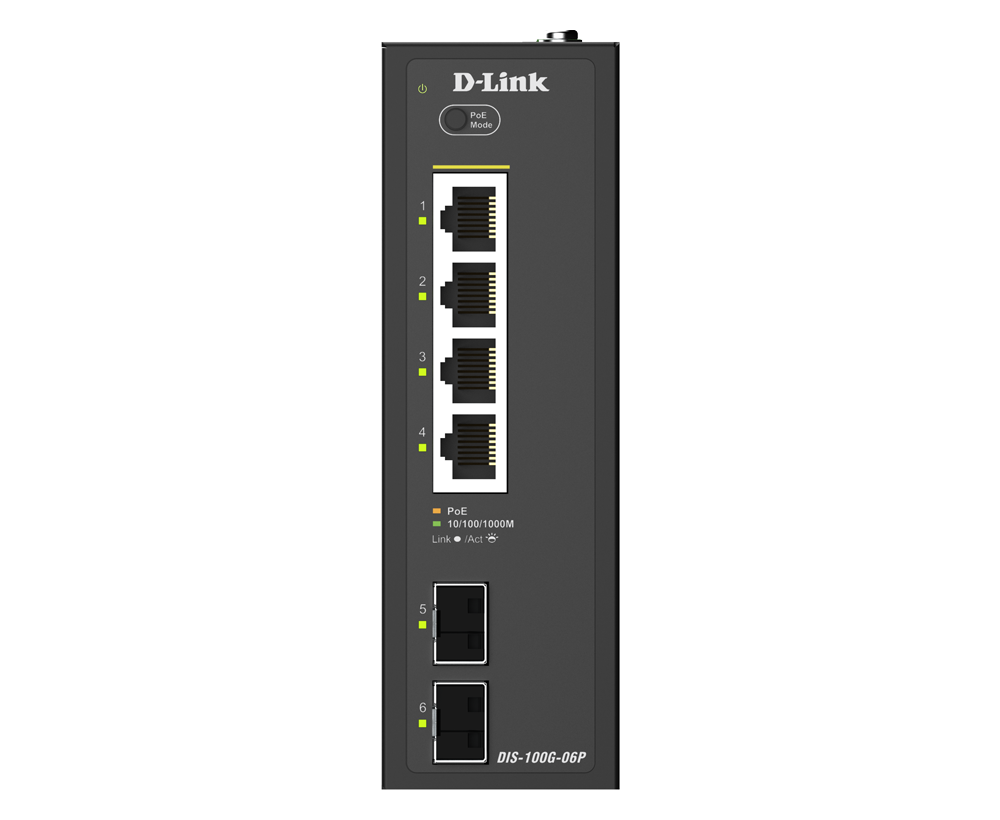 The DIS-100G-06P is an industrial unmanaged switch equipped with four 1G PoE ports and two SFP ports, providing plug-and-play simplicity deployment. The SFP ports support long-range data transmission, removing the distance limitations of traditional Ethernet cabling. With reliable, high-performance operation, it's well-suited for edge deployments in applications like HD surveillance, wireless access points and more.