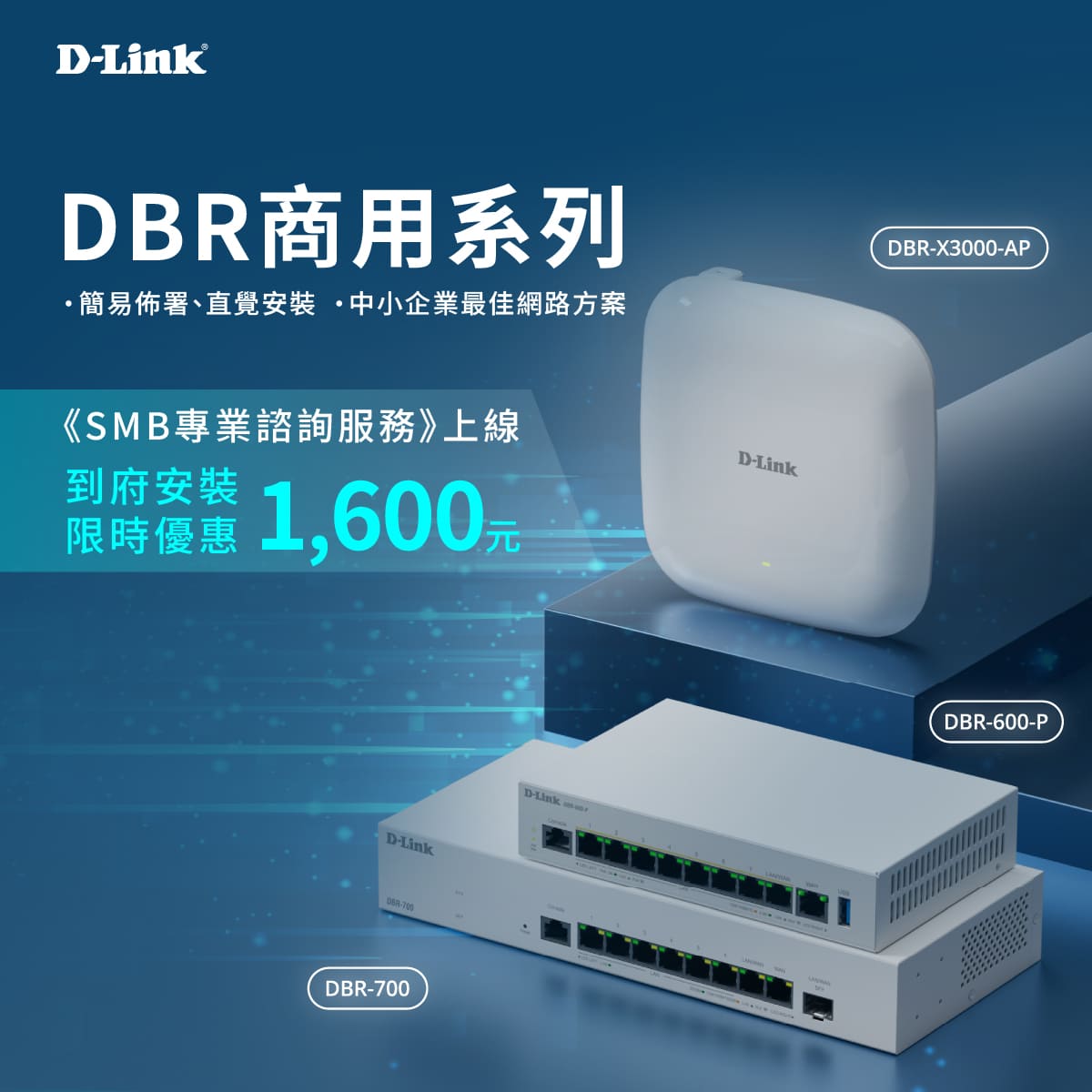全新的 DBR 系列包含 DBR-600-P 與 DBR-700 企業級智慧型有線路由器,以及 DBR-X3000-AP 無線基地台。此系列特別針對 100 人以下的中小企業環境設計,適用於新創公司、零售門市、辦公室與教育機構。DBR-600-P與DBR-700可向下和DBR-X3000-AP搭配使用外,也可以與DMS/DGS無網管型交換器做快速系統擴充,具備高相容延伸、高直覺安裝,協助業主大幅降低基礎網通設備的建置成本。